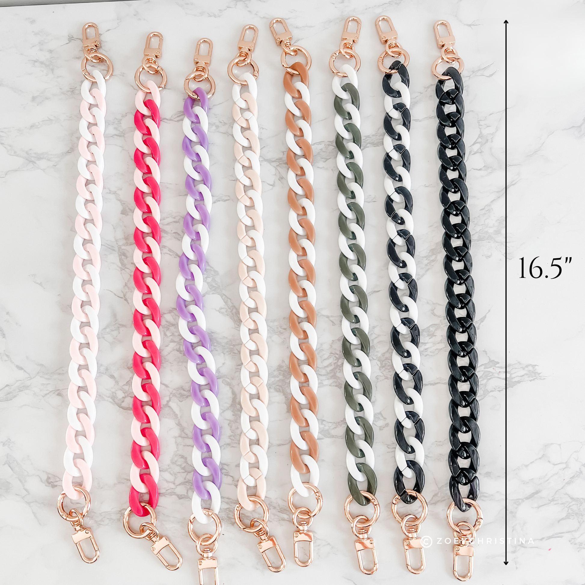 Style Meets Function Add a bold pop of color and texture with our 16.5" Chunky Acrylic Bag Chains. Available in 8 stunning color combos, each chain features gold hardware and a trendy, oversized link design—perfect as a statement accessory, purse handle replacement, or decorative charm for handbags, totes, clutches, and more. Key Features: Length: Approx. 16.5" – ideal for shoulder or handheld bags.