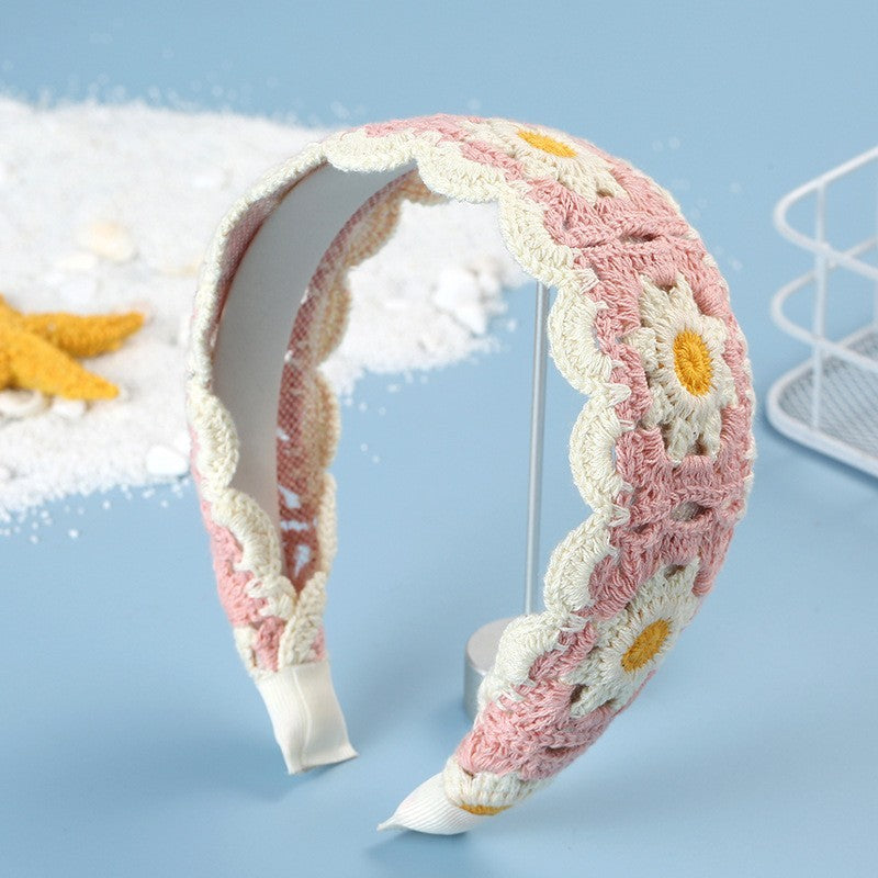 The Floral Crochet Soft Woven Knit Headband, handmade featuring delicate floral crochet details on a soft, stretchy knit band, it offers both comfort and style. Perfect for keeping hair in place while adding a vintage-inspired, cottagecore flair, this headband is ideal for everyday wear. DIMENSION length: 6" width: 5"