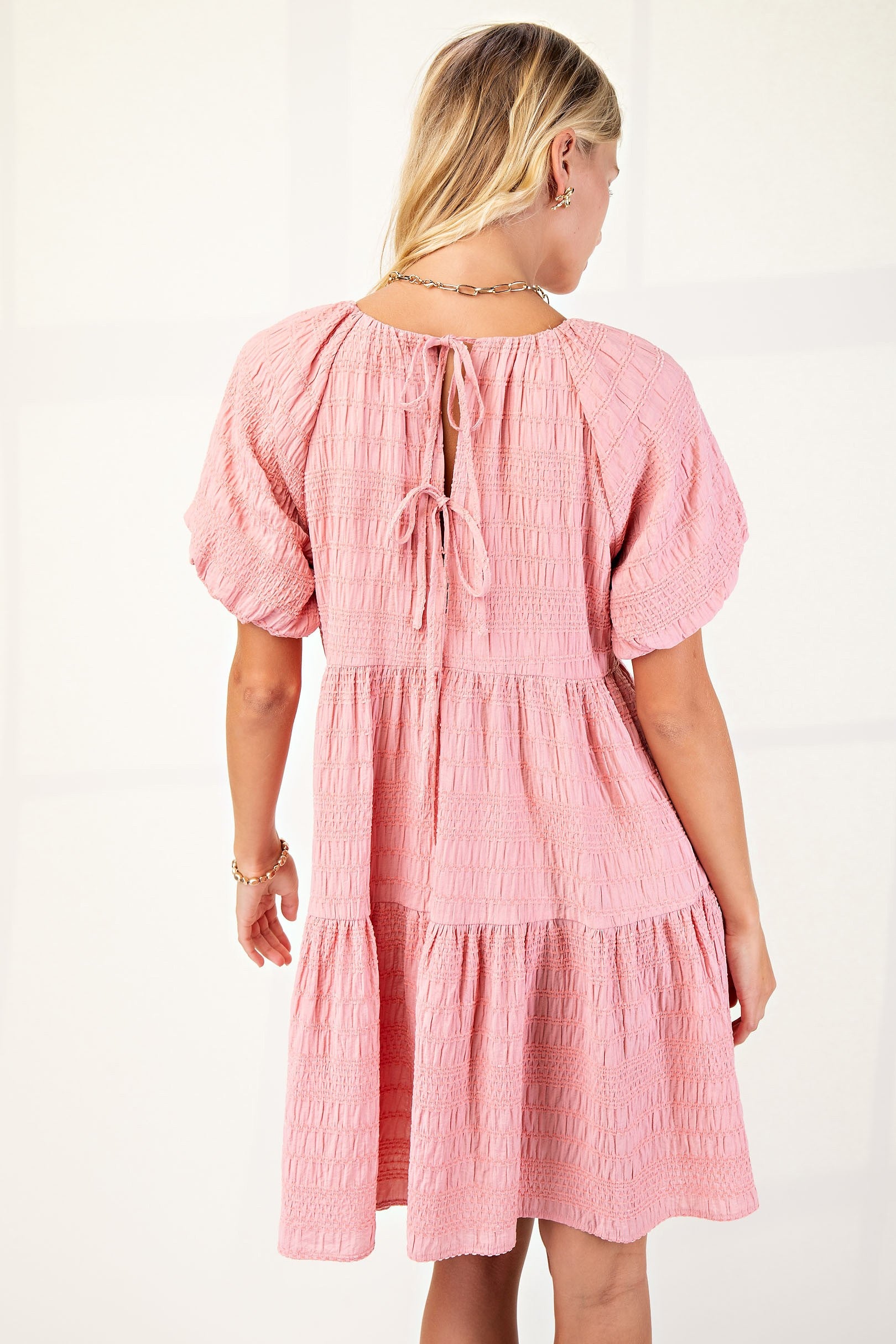 Textured Loose Fit Dress With Bow Tie