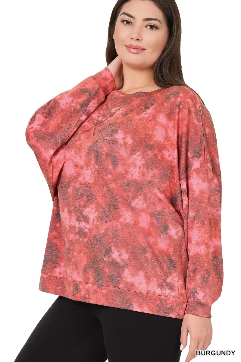 ZENANA FRENCH TERRY TIE DYE OVERSIZED DROP SHOULDER TOP